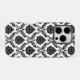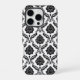 A vintage style decorative damask surface pattern influenced by rococo classical design in black detail on a white background.
