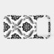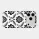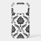 A vintage style decorative damask surface pattern influenced by rococo classical design in black and grey details on a white background.