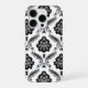 A vintage style decorative damask surface pattern influenced by rococo classical design in black and grey details on a white background.