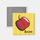 A red rocoto chilli pepper is decorated with patterns inspired by the colourful textiles of Peru and sits on a yellow background with a smaller version of the same pattern and a script label in the corner. This spicy pepper is eaten in Peru and Bolivia and has been cultivated in the area since pre-Incan times.