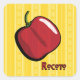 A red rocoto chilli pepper is decorated with patterns inspired by the colourful textiles of Peru and sits on a yellow background with a smaller version of the same pattern and a script label in the corner. This spicy pepper is eaten in Peru and Bolivia and has been cultivated in the area since pre-Incan times.