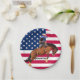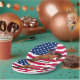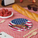 A bucking horse and rider get some air over an American flag during a bull riding competition.