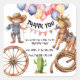 Cowboy Party Thank You stickers. Fun and festive stickers for each attendee of the party. This fun and festive design captures the spirit of the Wild West with a playful cowboy, his trustry horse, a classic wagan wheel, and a rugged cactus. The gift tag is topped with colorful balloons and flags, adding a touch of party cheer. A rope detail ties it all together, making this the perfect sticker for a Western-themed celebration. Personalize it with a special thank you from your child's special day,