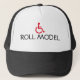 For role models on a roll. ROLL MODEL wheelchair handicapped trucker hat available in 11 colour combinations, only at Zazzle! Red wheelchair graphic with ROLL MODEL black uppercase typography in Gargoyle font.