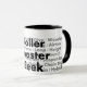 Proclaim your roller coaster fandom with this roller coaster geek coffee mug. It includes roller coaster terminology inlcluding: Duelling, twister, dive, wooden, spinning, boomerang, airtime, speed, g-force, loop, height, hyper, launch, corkscrew, inverted, suspended, out and back, flying, chain dog, lift hill, hybrid