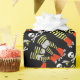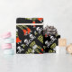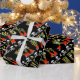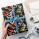 roller derby themed gift wrap. Roll of wrapping paper is printed with a diagonal stripe of roller derby legs in black and yellow striped stockings, red skates, and rows of killer bees and skulls.