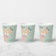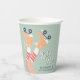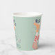 Cool sage green roller skating birthday party paper cups featuring a retro-inspired illustration of pastel orange roller skates on a girl wearing red and white striped tube socks and "Let's Roll" in a white script. Add her name dark teal blue typography.
