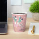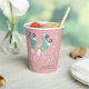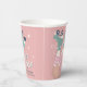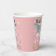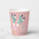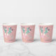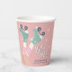 Fun pastel pink roller skating birthday paper cups featuring a retro-inspired illustration of teal roller skates on a girl wearing pink-striped tube socks and "Let's Roll" in a 70's style script. Add her name dark teal blue typography.