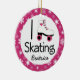 I Love Heart Skating slogan has cute pink and white skating boot logo. Great gift for girls who love to skate. Pink and white snowflake border and her custom name on this one sided version of our ornament gift.