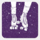 An illustration of a woman or girl roller skating at night. Their feet and roller skates are in the purple, star filled, night sky above a forest.