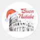 Buon Natale holiday design and Italian Natale with picture of the Roman Colosseum wearing a Santa Claus hat with snow falling about.