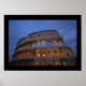 A striking photo of the roman colosseum which is an ancient landmark in Rome, Italy. An interesting angle and perspective. Shot at night with the arches lit up and glowing orange. The sky has dark blue stormy clouds above.
