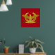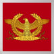 A Roman golden eagle on a legionary red background, wreathed in victory and bearing thunderbolts. SPQR.