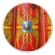 Red decorated Roman Empire military shields scutums in a row and the text INVINCIBLE on t-shirts. Prints and gifts for fun and good mood.