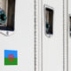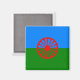 This design features the Romani flag, which is the international flag of the Romani people. The flag consists of a background of blue and green, representing the heavens and earth, respectively; it also contains a 16-spoke red chakra, or cartwheel, in the centre, which represents the itinerant tradition of the Romani people and is also an homage to the flag of India. The flag was approved by the representatives of various Romani communities at the first World Romani Congress (WRC), held in Orpington in 1971.