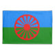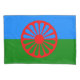 This design features the Romani flag, which is the international flag of the Romani people. The flag consists of a background of blue and green, representing the heavens and earth, respectively; it also contains a 16-spoke red chakra, or cartwheel, in the centre, which represents the itinerant tradition of the Romani people and is also an homage to the flag of India. The flag was approved by the representatives of various Romani communities at the first World Romani Congress (WRC), held in Orpington in 1971.