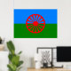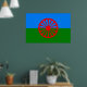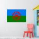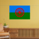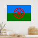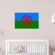 This design features the Romani flag, which is the international flag of the Romani people. The flag consists of a background of blue and green, representing the heavens and earth, respectively; it also contains a 16-spoke red chakra, or cartwheel, in the centre, which represents the itinerant tradition of the Romani people and is also an homage to the flag of India. The flag was approved by the representatives of various Romani communities at the first World Romani Congress (WRC), held in Orpington in 1971.