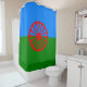 This design features the Romani flag, which is the international flag of the Romani people. The flag consists of a background of blue and green, representing the heavens and earth, respectively; it also contains a 16-spoke red chakra, or cartwheel, in the centre, which represents the itinerant tradition of the Romani people and is also an homage to the flag of India. The flag was approved by the representatives of various Romani communities at the first World Romani Congress (WRC), held in Orpington in 1971.