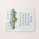 Jigsaw puzzle with inspirational quote scripture depicts a simple watercolor landscape including a house on the lake with trees and sea grass. It features an encouraging Christian Bible Verse Romans 15:13, "May the GOD of HOPE fill you with all JOY and PEACE as you trust in Him."