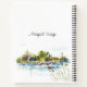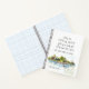 Personalised notebook, journal with with inspirational quote scripture depicts a simple watercolor landscape including a house on the lake with trees and sea grass. It features an encouraging Christian Bible Verse Romans 15:13, "May the GOD of HOPE fill you with all JOY and PEACE as you trust in Him." Customise the back with a name or details of your choice.