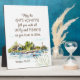 Tabletop plaque with inspirational quote scripture depicts a simple watercolor landscape including a house on the lake with trees and sea grass. It features an encouraging Christian Bible Verse Romans 15:13, "May the GOD of HOPE fill you with all JOY and PEACE as you trust in Him."