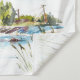 Tapestry with inspirational quote scripture depicts a simple watercolor landscape including a house on the lake with trees and sea grass. It features an encouraging Christian Bible Verse Romans 15:13, "May the GOD of HOPE fill you with all JOY and PEACE as you trust in Him."