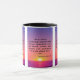 This two-tone mug displays a tamrin print font with black letters displaying the "Romans 5:8" KJV bible scripture verse over a background picture featuring an oceanside view showcasing a bright sunset under this vibrant coloured sky in this ocean view theme. This verse is referencing the Book Of Romans 5th chapter showing the 8th verse in this bible scripture quote theme from the King James bible The rim & handle are glazed in matching colours available in 11-ounce or 15-ounce sizes microwave and dishwasher safe ceramic construction.