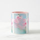 This two-tone mug showcases a design that features a Fabrica print font with pink coloured letters light pink outline displaying the "Romans 7:6" KJV bible scripture verse over this picture showing pink and white flowers over a sky blue back with a dim view in the background of this faith based theme. This verse is referencing the Book Of Romans 7th chapter showing the 6th verse in this bible scripture quote theme from the King James bible. The rim & handle are glazed in matching colours available in 11-ounce or 15-ounce sizes microwave and dishwasher safe ceramic construction.