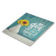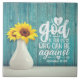 Inspirational scripture ceramic tile depicts a still life photograph with a white vase, two yellow sunflowers and a rustic blue wood background. It features Bible Verse Romans 8:31, "If God is for us who can be against us?"