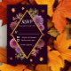 Romantic autumn dahlia wedding: Fall leaves accompany a floral frame in various shades of purple