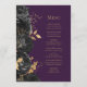This elegant modern wedding menu features a border of black flowers and gold faux foil leaves. Customise the gold-coloured italic text on a dark purple background. The back of the menu is solid purple,