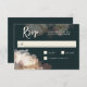A uniquely elegant wedding RSVP card design with subtle light and shadows and beautiful floral elements that include double tulips, white berries, and Icelandic poppies. The colour scheme includes off-white flowers with slight tinges of pale blush and a luxurious deep slate grey background. Personalise the text template with your required response date.