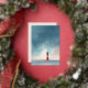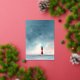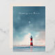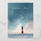 This wedding invitation features a serene and romantic design with a vertical layout, showcasing a gradient sky transitioning from soft blue to gentle pink. A striking red and white lighthouse stands prominently on calm waters, creating an ethereal atmosphere enhanced by faint seagulls in the sky. The elegant typography combines script and serif fonts, providing customisable placeholders for names, dates, and locations, while maintaining a tranquil and sophisticated mood perfect for a formal celebration.
