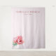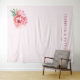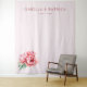 This elegant wedding backdrop features a minimalist design with soft pastel tones, primarily in light blush pink. The layout includes ample negative space, creating a clean and sophisticated look. A detailed watercolor illustration of peonies adds a romantic touch to the bottom left corner, while classic serif typography centres the customisable names and date at the top. Perfect for celebrating love and commitment, this design exudes grace and understated elegance, ideal for any romantic occasion.
