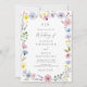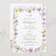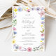 Celebrate your special day with this charming watercolor wildflower wedding invitation, featuring a hand-painted wreath of pink, purple, blue, and yellow garden blooms. The delicate floral frame surrounds your wedding details in modern script and classic serif fonts, creating a timeless design that’s perfect for rustic, boho, or garden weddings.
