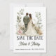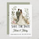 Announce your special day with this stunning Save The Date card featuring a warm botanical scene and a romantic bride-and-groom illustration.