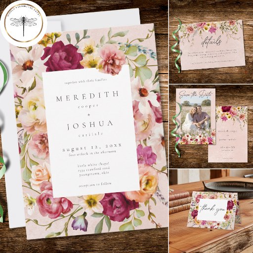 Celebrate your love with this romantic burgundy and blush floral wedding response card without dinner choices design. Featuring a lush watercolor border of spring blooms, it is perfect for a whimsical garden ceremony. This elegant aesthetic provides a stunning, high-end look for your modern wedding celebration. Created by Simply Farmhouse Press.