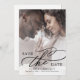 This romantic calligraphy QR Code photo overlay save the date card is perfect for a simple wedding. The modern classic design features fancy swirls and whimsical flourishes with gorgeous elegant hand lettered typography.