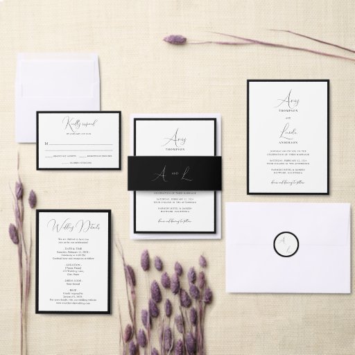 Romantic Classic White & Black Script Wedding Invitation Belly Band