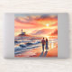 A dreamy coastal scene unfolds at golden hour, where a couple strolls along the shoreline beneath a glowing sunset and a distant lighthouse. Soft pastel skies blend coral, peach, and warm amber tones with rolling ocean waves, creating a tranquil, romantic atmosphere. The painterly style feels whimsical and cozy, evoking cottagecore and coastal folk aesthetics with a gentle sense of wander and togetherness. AI generated artwork.
