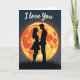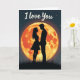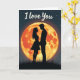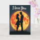 This design shows two black silhouette figures standing close together in front of a huge full moon. Their faces tilt toward each other as if they’re about to kiss, and their hands meet between them in a gentle hold 💘. The moon fills most of the background and glows in warm orange and deep reddish-brown tones, with a lightly textured surface. Around it, the sky is a dark blue with a few small, star-like dots scattered near the top. Along the bottom edge, a strip of dark grass adds a simple ground line beneath the couple. Near the upper part of the moon, the words “I love You” appear in thin, flowing black lettering. Overall, it feels like a quiet, romantic moment under the night sky ❤️.