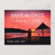 A "save the date" postcard with a loving couple on the beach at sundown.