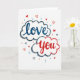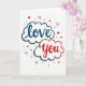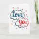 This card shows two thought-bubble shapes on a white background, each holding one word of the message “love you.” The top bubble is outlined in deep blue with little hatched shading near the bottom edge, and it contains the word “love” in a textured blue marker-style lettering. Below and slightly to the right, a second bubble is outlined in red with similar shading, and it holds the word “you” in red marker-style lettering. Around the bubbles are small hearts—some filled red, some just red outlines—plus short dash marks in red and blue that feel like little bursts around the message. The simple white space makes the blue and red stand out, so your eyes go straight to the words. It feels like a quick, honest note you’d pass to someone you care about, which can mean a lot because it’s direct and sweet 🥰. It’s an easy way to share Valentine’s Day feelings with someone you love or a close friend ❤️.