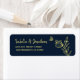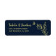 Unique simple wedding return address label featuring romantic and elegant gold flowers and butterflies on navy background