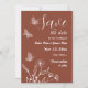 Unique simple wedding save the date featuring romantic and elegant white flowers and butterflies on terracotta background
