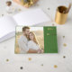 This wedding guest book features a split layout with a large photo placeholder on the left, showcasing a couple in a warm, natural setting. The right side is adorned with a bold green block that contrasts beautifully with elegant gold typography, offering customisable space for names and details. The design combines modern colour blocking with classic elements, creating a romantic and intimate mood perfect for capturing memories from your special day.