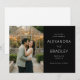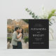 This wedding save the date features a split layout with a romantic photograph of a couple embracing in front of a warmly lit greenhouse, creating an intimate and cosy atmosphere. The right side showcases elegant text on a black background, using sophisticated serif fonts that highlight the event details. The colour palette combines natural greens and browns from the foliage with warm yellow hues from the string lights, evoking a classic and timeless feel. Perfect for setting the tone for a memorable celebration, this design balances visual charm with clear communication, making it ideal for couples looking to share their special news with style.
