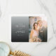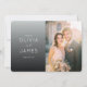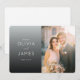 This wedding thank you card features a modern and elegant design with a split composition. The left side showcases a gradient background in shades of grey, complemented by soft white typography that adds a touch of sophistication. On the right, a warm-toned photo placeholder captures a joyful moment, enhanced by a subtle blur effect for a romantic feel. The overall layout balances text and imagery seamlessly, creating a harmonious visual flow perfect for expressing gratitude after a special occasion like a wedding.