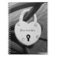 Romantic heart shape love lock photo notebook. Personalizable text in elegant script typography above keyhole. Stylish wedding, school and office supplies.