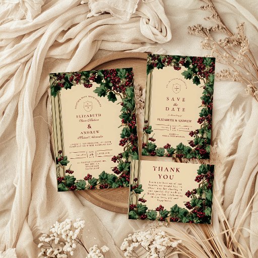 Bring timeless elegance to your big day with this romantic ivy and berry wedding design. Deep green ivy leaves and clusters of rich red berries frame your details in a vintage botanical style that feels both classic and enchanting. Perfect for couples planning a traditional, rustic, or winter wedding, this design blends old-world charm with natural beauty. Personalise with your names, date, and venue for a stunning keepsake that sets the tone for your unforgettable celebration.